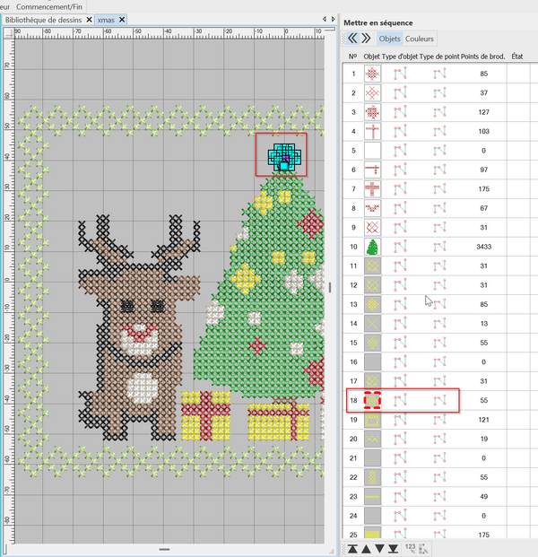 Pour la conception, il est indispensable d’optimiser les zones de couleur afin de créer de vraies plages connectées. On ne peut pas dissimuler les fils de liaison sous un point. Peut-être qu’un point triple résout partiellement ce problème. Dans la scène de Noël, la bordure verte ne comporte aucun saut, tandis que les zones blanches en présentent plusieurs.