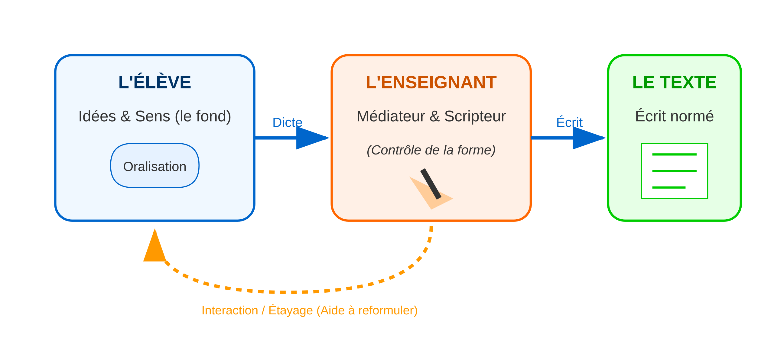 Schéma illustrant le processus de la dictée à l'adulte et le rôle de médiateur de l'enseignant. Créé pour l'article Dictée à l'adulte.