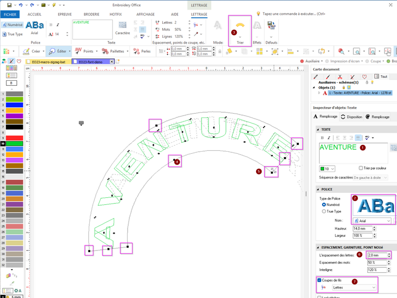 - Pour les phrases longues, pensez à fractionner le texte en plusieurs objets afin de mieux contrôler l’ordre de broderie.