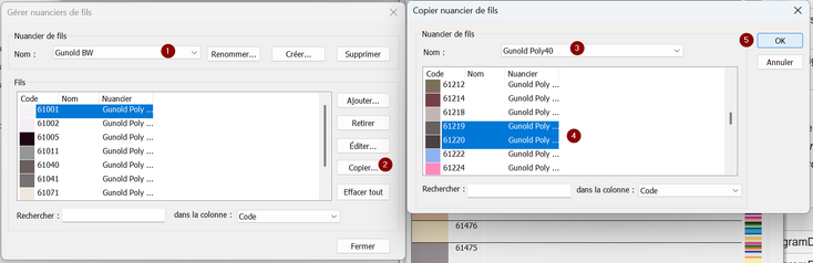 - Un catalogue de fils est défini soit par une ligne de produit (par exemple Poly40 de Gunold), soit par une palette créée par l’utilisateur. Selon les besoins, on peut afficher le code, le nom, la couleur et le numéro Pantone. Il est également possible de définir des couleurs favorites.