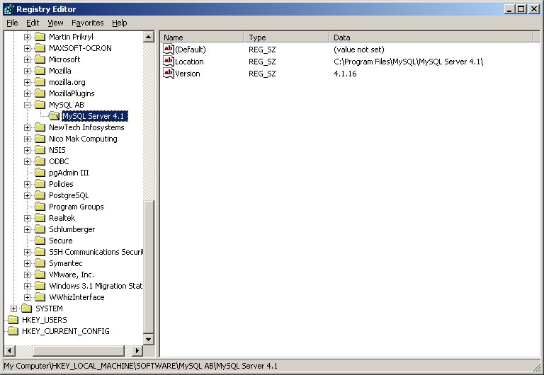 - Hack would be to manually edit the registry with this information from MySQL AB and this posting and picture by Ernie Ghiglione. Basically one needs to reproduce the MySQL entry from the official MySQL AB installer: